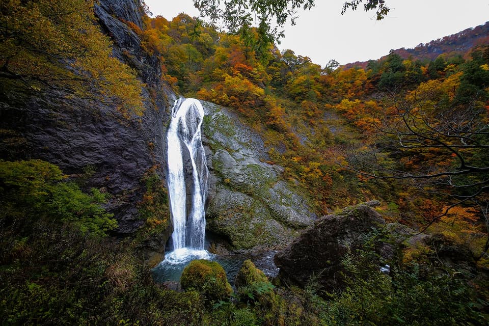 大鳥池から流れ落ちる七段の滝。新緑・紅葉は特に美しい。高さ90メートルの断崖を二段で落ちる。落差は上方50メートル、下方40メートル。近くの七ツ滝公園からは滝の全景が見通せる。朝日連邦の登山口でもある大鳥池は、伝説の巨大魚、タキタロウが生息すると言われている。