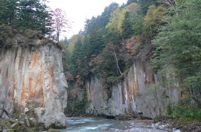 熱い溶岩がゆっくりと冷却される過程で垂直に、低温側から高温側へと伸びてできた石狩川にある岩盤。層雲峡の峡谷美が最も真価をみせる地域。紅葉期は格別美しい。