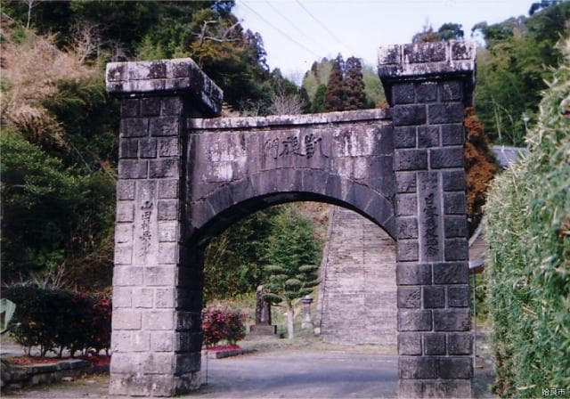 石造りの凱旋門は、鹿児島が誇るアーチ式の石橋技術を応用したもので、全国的でも1基しかない貴重な文化財です。使われた石材は凝灰岩で、言い伝え によると、上名の池平から切り出したといいます。石工は細山田ケサグマという人だったそうです。