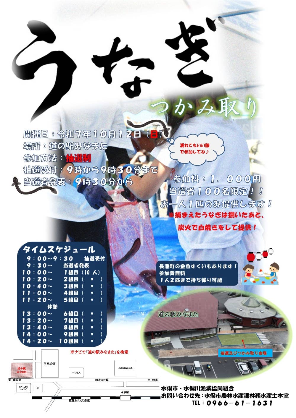 - 9:00~抽選受付/9:30~当選者発表/10:00~1組目のうなぎのつかみ取り開始