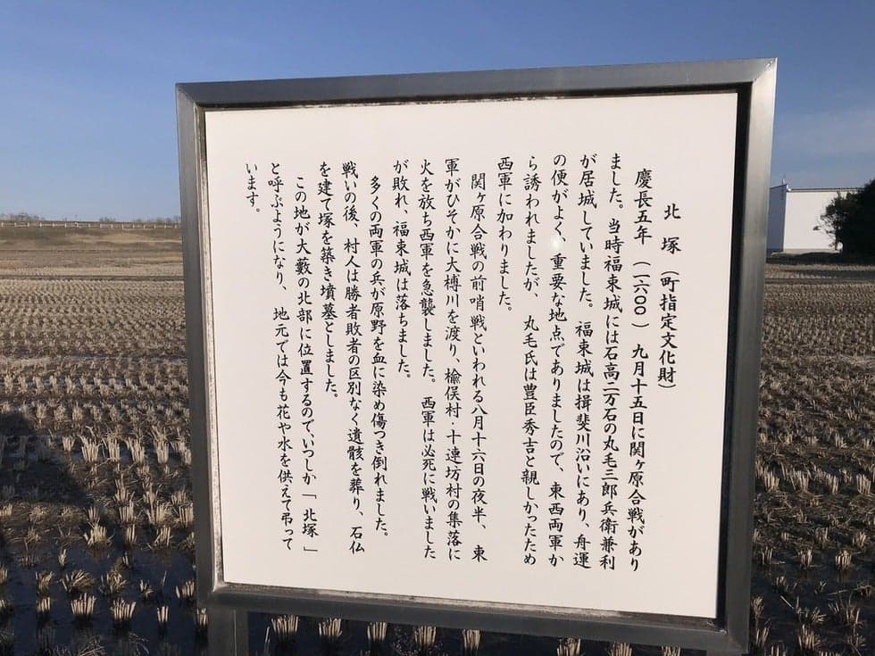 輪之内町東大藪の北部、大藪地内の田んぼの中に、一畝ほど小高く土を盛り上げた塚(現在は史跡として整備しています)。関ケ原の合戦の最初の前哨戦「福束城の戦い」において戦死した東西両軍の死者をあわれんで土地の人たちが埋葬して成仏を祈った塚。お堂の仏様には、どなたが詣られるのかいつも新しい花とお水が供えられています。