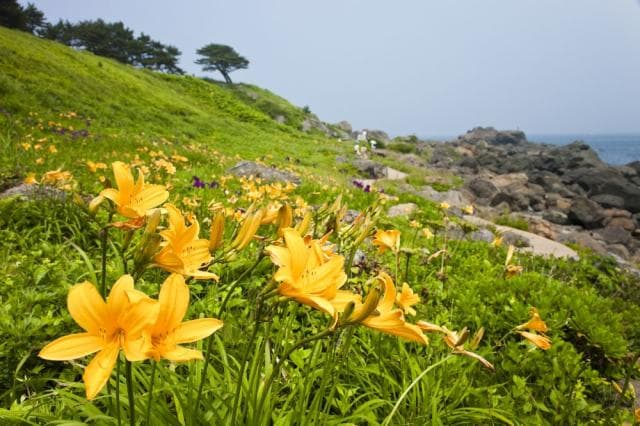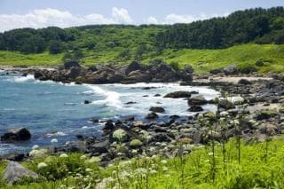 岩礁の入り江に整備された遊歩道沿いに花々が咲き誇り「花の渚」と呼ばれる種差海岸を代表する景観の一つ。初夏の遊歩道沿いにはハマヒルガオやスカシユリなどの海浜植物と、ニッコウキスゲ、ノハナショウブなどの高山植物が隣り合って咲く希少な場所で、幻想的な雰囲気を醸し出します。