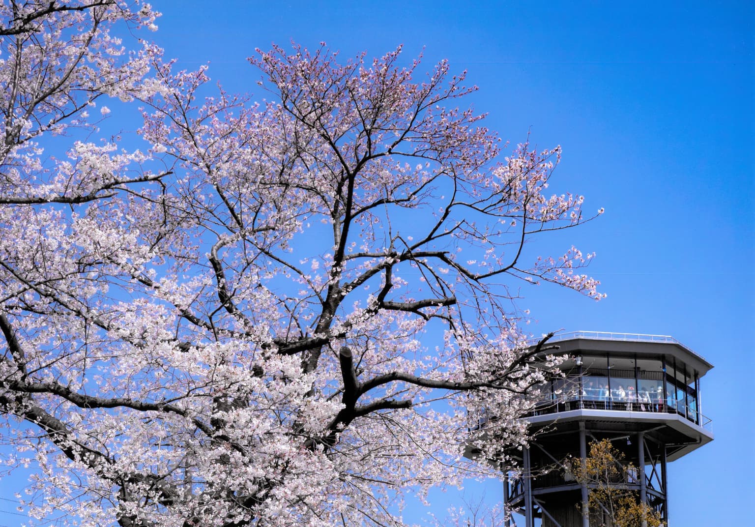 また、隣接する「さくらであい館」の展望塔では、約25mの高さから背割堤の桜並木を一望することができます。