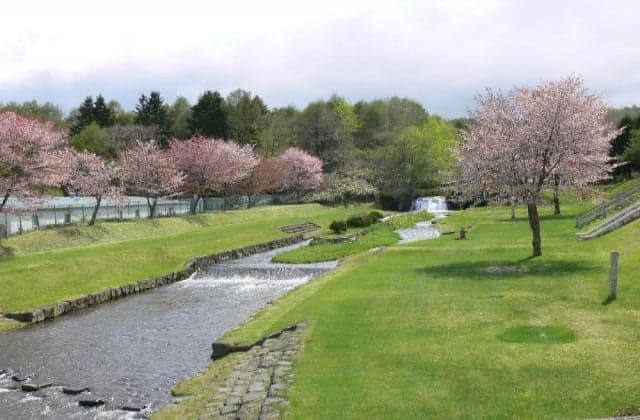 川遊びができる河川敷や、散歩道、アスレチック遊具などがあり、人々の憩いの場として親しまれている「鹿部公園」は、隠れたお花見スポットです。毎年春には約300本の桜が咲き誇り、たくさんの花見客や遠足でにぎわいます。手入れの行き届いた芝生の上でくつろぐことができ、夏にはオオデマリ、秋にはナナカマドなど四季折々の花や草木を愉しむことができます。また、バーベキューが出来るスペースもあります。