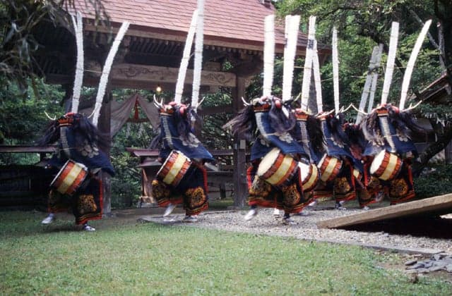 背に2mほどのササラ竹を背負い鹿面をかぶり,腹に吊った太鼓を打ち鳴らしながら踊る。江刺梁川が本家の金津流を継承した、躍動感あふれる踊り。