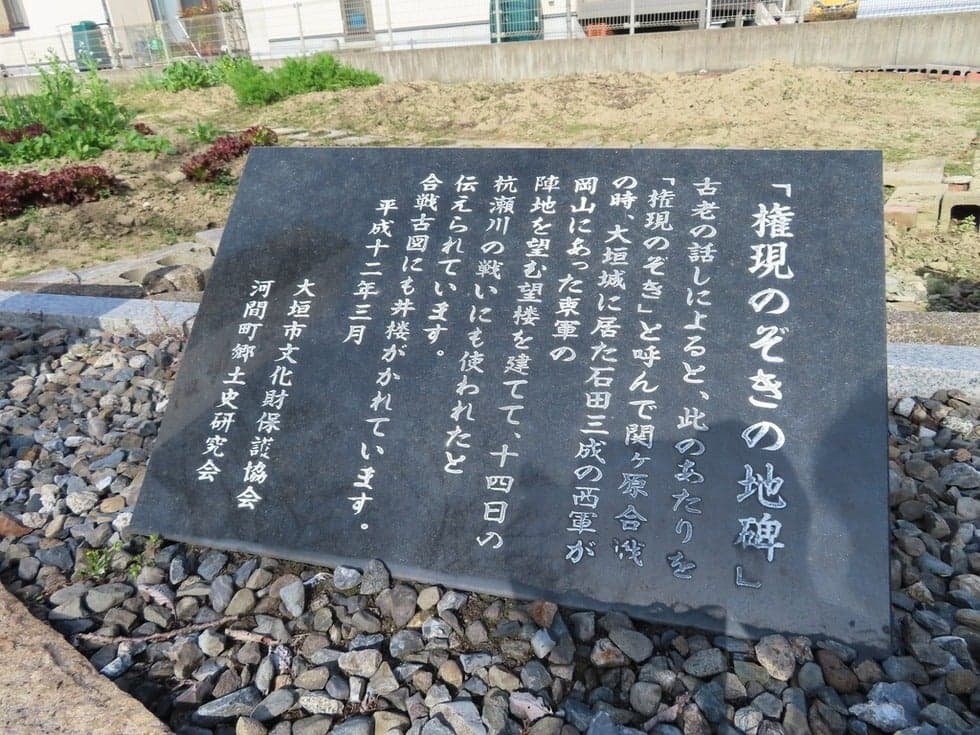 この辺り(大垣市河間)を「権現のぞき」と呼んでいたと伝えられています。関ケ原の合戦の時、大垣城に居た西軍?石田三成が、東軍の陣地「岡山(勝山)」を望む望楼を立てました。慶長5年(1600年)9月14日、関ケ原の合戦の前哨戦?杭瀬川の戦いにも使われました。関ケ原の合戦図にも井楼が書かれています。