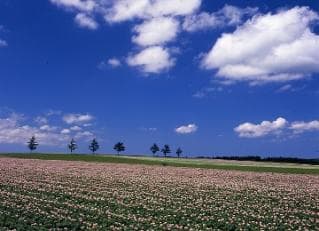 大規模畑作風景、絶好のカメラアングル。馬鈴薯の花(6月下旬~7月中旬)、麦の出穂(6月下旬~7月中旬)、コンバイン刈取風景(7月中旬~8月中旬)。四季折々の表情を見せてくれます。