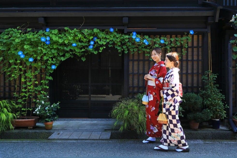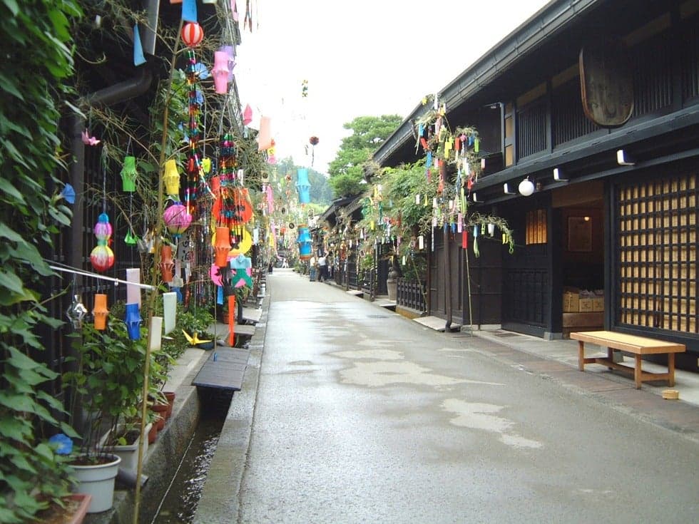 城下町の中心、商人町として発展した高山の上町、下町の三筋を古い町並と呼んでいます。出格子の連なる軒下には用水が流れ、造り酒屋には杉の葉を玉にした「酒ばやし」が下がり、町家の大戸や、老舗の暖簾が軒をつらねています。上町には、駄菓子屋さんや伝統工芸のお店、名物の「みたらしだんご」のお店などが並び、多くの観光客で賑わいます。下町は、市民生活関連の店舗が残る貴重な町並みです。菓子、餅屋、骨董屋、農機具、畳、文房具、郵便局、料理屋など昔ながらの町並みで、高山の通な観光スポットです。