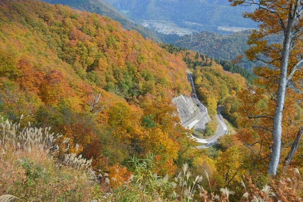 蛇谷川沿いに岐阜県と石川県を結んでいる山岳道路「白山白川郷ホワイトロード」。飛騨・美濃紅葉33選にも選ばれる紅葉の名所です。ブナ原生林の紅葉はひときわ美しく、紅葉時のドライブルートとして知られています。白川村の木であるブナの原生林を公園として整備した白川郷展望台は、眼下に白川郷が広がり、遠くは中部山岳やロックフィルダムの御母衣ダム、天生峠などを望むことができます。また、散策コースとして、ブナの小径(徒歩一周約15分)があり、紅葉をゆっくり満喫することができます。例年は、10月中旬~11月上旬が見ごろ。
