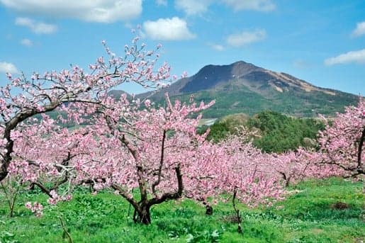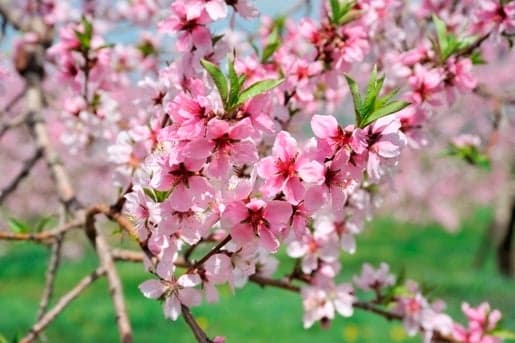 桃のピンクの花とりんごの白い花が交わって美しいコントラストを生み出しています。