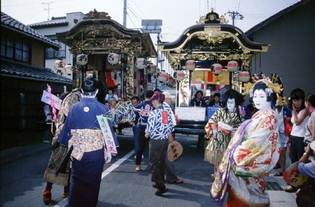 宮道天神社の祭礼。江戸時代、大干ばつのときに雨乞いをしたところ大雨が降ったことから始まったといわれています。日曜日に行われる花魅(おいらん)や武士に扮する「歌舞伎行列」が目玉。