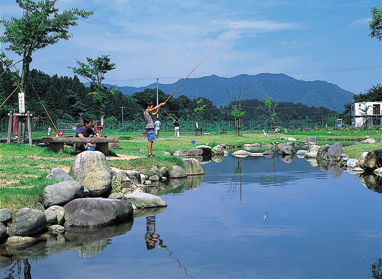 胎内川の湖畔にある釣り堀公園!ニジマス、ヤマメ、イワナを釣り上げ、その場で炭火焼きに!