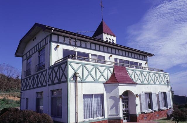 メルヘンチックな建物(全体・北欧の山小屋風・看視塔神戸異人館の中にある風見鶏と笛吹き少年のイメージの組合せ)。昭和55年建築。