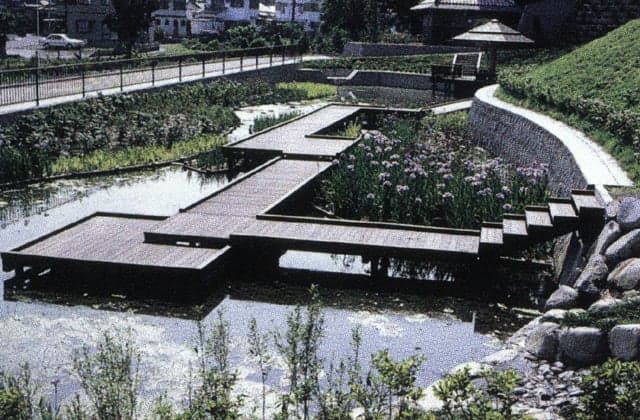 山の斜面を利用した自然の散策路。「水」「花」「森」をテーマに、池の中には花菖蒲が咲き、梅や山桃の木立の中を散策できる遊歩道があり、花が咲き、木々が芽吹く季節には絶好の森林浴が楽しめます。