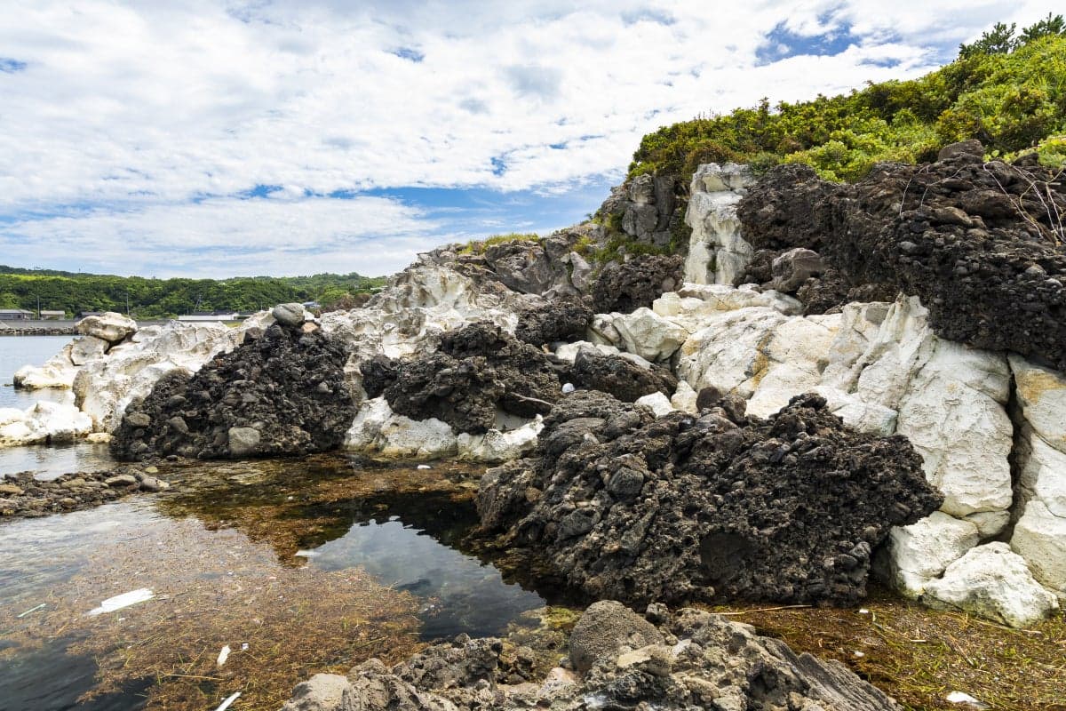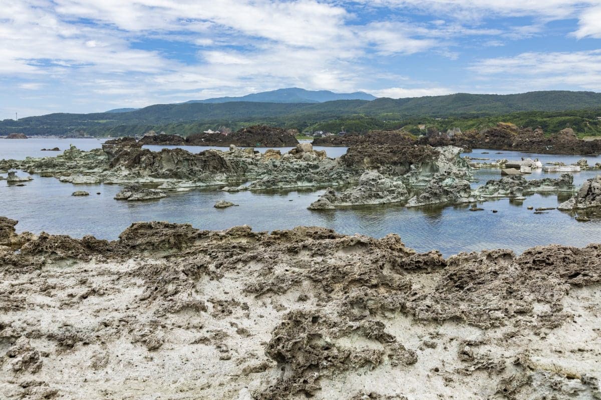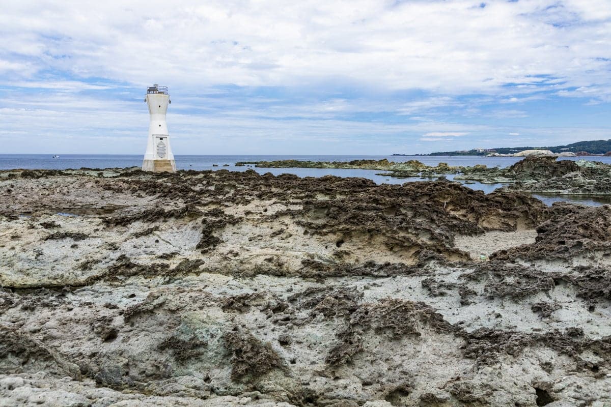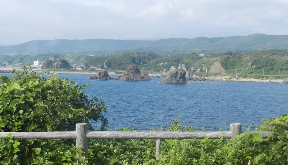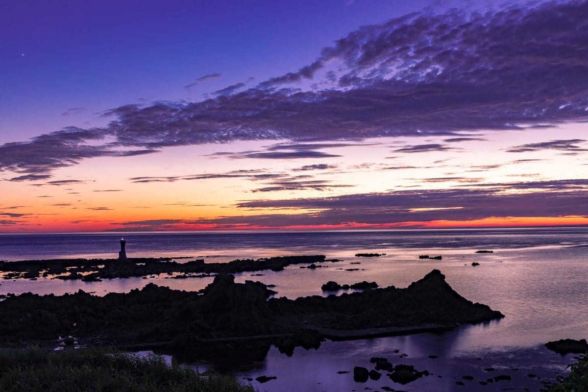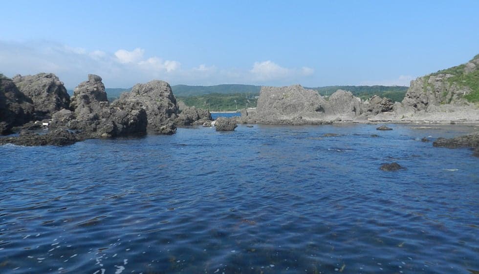 七浦海岸の中央に位置する岬で、平らな岩場が続く景勝地。隆起海岸の特徴を持つ岬一帯は「佐渡弥彦米山国定公園」に指定されています。渚には奇岩が点在し、変化のある海岸美を形成。磯遊び、海水浴、シュノーケリング、釣りに人気のスポット。大海原に沈む夕日の素晴らしさでも知られています。