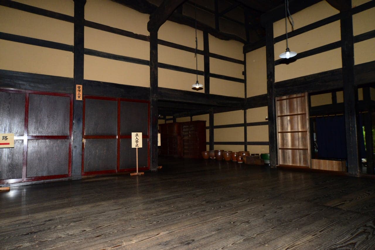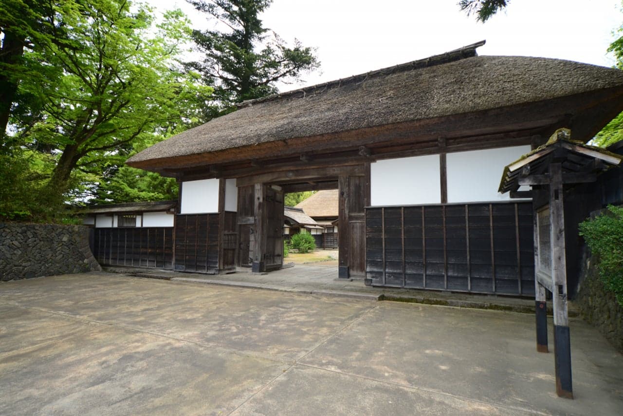 現在の母屋は茅葺寄棟造りの約300年前に建築されたもので、周囲には幅2~4mのお堀を巡らし、その内側には土塁生垣、正面には城門級の大扉のある長屋門形式の茅葺寄棟造りの表門があります。