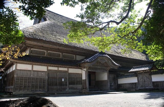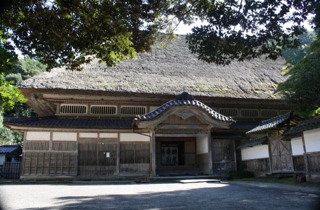 江戸時代天領の大庄屋であった上時国家の屋敷。入母屋造りで茅葺唐破風造りの玄関をもつおよそ180年前の建物。完成までに28年を要した。