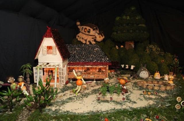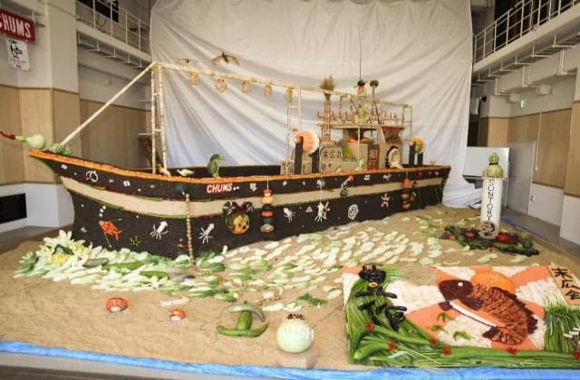農作物や自然の草木を素材に人物、風景、物語の一幕などをつくり、五穀豊穣を感謝する庶民的芸術祭です。その年の話題の人物やアニメキャラクターなどを表現したユニークな「つくりもん」が展示されます。中には高さ5mに達するものもあります。