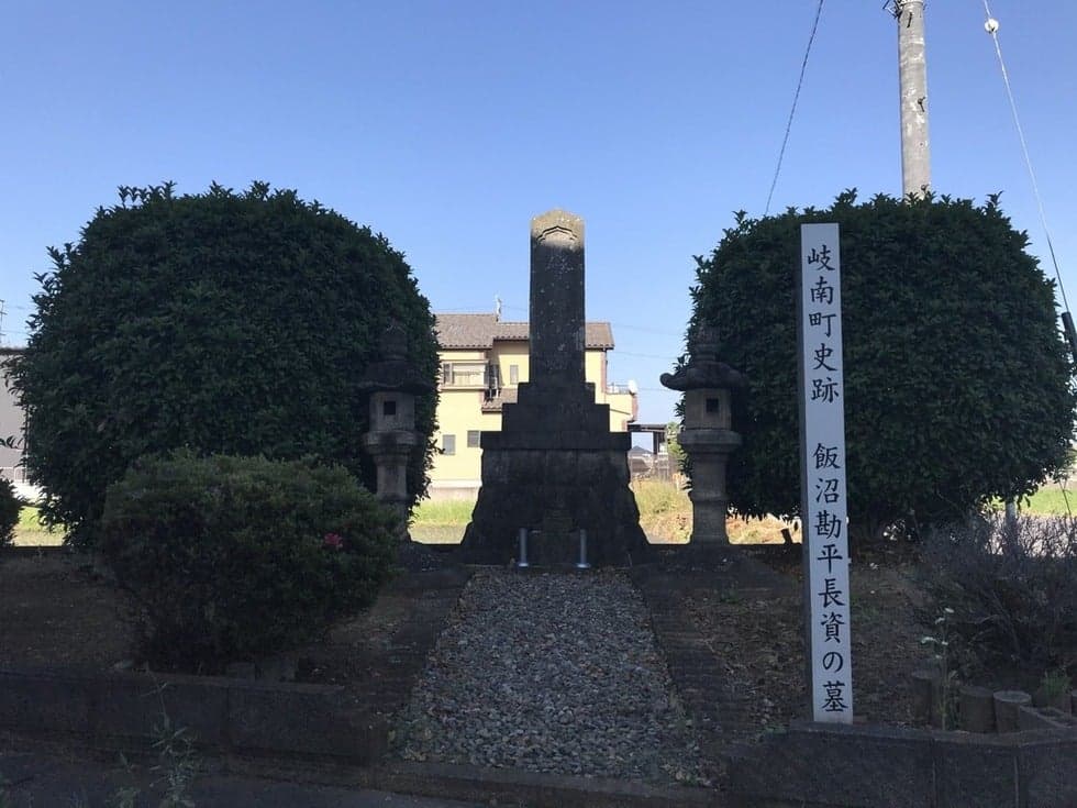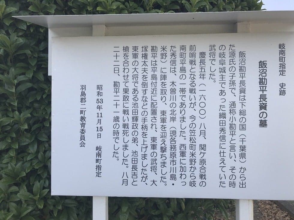 飯沼勘平長資は、岐阜城主・織田秀信(三法師)の家来で「岐阜四天王」の一人。関ケ原の合戦の前哨戦、「米野の戦い」で多くの手柄を立てた当時21歳の武将(大垣 池尻城主の子)。東軍大将池田輝政の弟、池田長能と一騎打ちをして戦死しました。尚、南西約500mの場所には、米野の戦い跡の碑(岐阜県羽島郡笠松町)が建てられています。