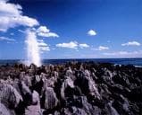 三陸復興国立公園の景勝地である岩井崎はペルム紀化石産地の標準地のひとつ。2億5千万年前のサンゴや有孔虫を含んだ石灰岩が波に洗われ現在の奇観を形成しています。震災によって奇跡的に表れた竜の松、ダイナミックに潮を噴き上げる潮吹岩の付近には、江戸時代に活躍した郷土出身の第9代横綱「秀ノ山」の銅像が立っています。