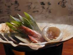 大きなホタテ貝にいしりダシと白身魚,イカ,エビその他季節の野菜を入れ煮ながら食べます。旅館・民宿で味わえます。