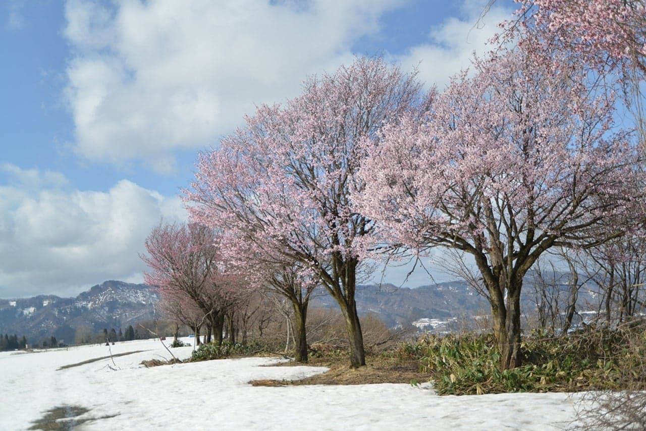 その河岸段丘沿いに200本以上の桜が並び、この1本1本全てが個人オーナー制になっています。桜が植えてあるところからは遠く山々まで見渡せ、残雪の山と桜のコントラストが魅力的の秘密のスポット。