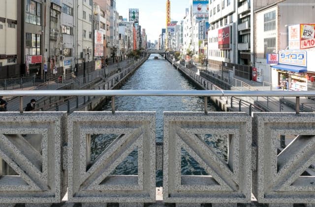 堺筋(紀州街道)が道頓堀を通るところに架けられた橋で、大阪市中央区に位置する。江戸時代には、日本橋の橋筋は「長町」と呼ばれ、古くからの宿場町だった。橋詰には船着き場があって水陸交通の要所として賑わい、とくに人通りの多かった道頓堀への曲り角にあたる南詰の西側には幕府の高札場(こうさつば:現在の官報掲示板)が設けられていた。当時は、橋長約40m、幅員約7mの木橋だったとか。明治から数回の改修工事を経たのち、昭和44年(1969)の地下鉄建設に伴って架け換えられ、現在に至る。橋詰には旧橋の親柱が残されている。また、日本橋界隈は明治時代、古書店街として賑わっていたが、戦後に入って自作のラジオ向けのパーツや工具などを扱う店が現れたことをきっかけに電気街として発展し、現在の「でんでんタウン」に至っている。