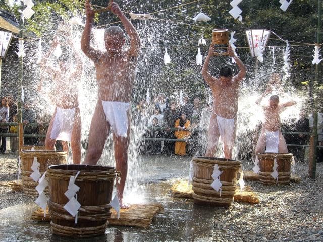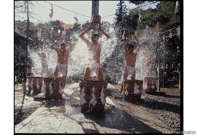 山梨県南西部、日蓮宗総本山身延山久遠寺(別称・妙法華院)で百日荒行を勤めた修法師たちが、雪の降る中、ふんどし姿で「水行肝文」を唱え、気合鋭く冷水を何度も何度も頭からかぶり、新年の泰平と除災得幸を祈願します。1月1日、2日に行われます。