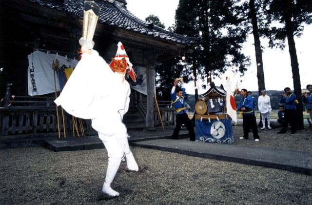 祭典の日は神楽連中による皇大神社の奉納が終わった後に、氏子の家々を舞い歩き、その家の家内安全、五穀豊穣、商売繁盛を祈る。