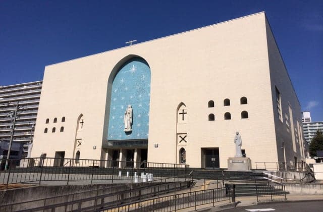 明治27年(1894)に「聖アグネス聖堂」として建てられたが、空襲で焼失。昭和38年(1963)に「大阪カテドラル聖マリア大聖堂」に生まれ変わった。敷地が細川大名家の屋敷跡であったことから、大聖堂前広場には細川ガラシャとキリシタン大名・高山右近の石像があり、壁面には、故堂本印象氏による画「最後の日のガラシャ夫人」が掲げられている。細川ガラシャは、明智光秀の三女で、細川忠興に嫁いでキリスト教の洗礼を受けた。関ヶ原の戦の際、人質として大坂城へ入ることを拒んで自決。一方、高山右近は高槻の領主で、禁止されていたキリストへの信仰を貫き、マニラに追放された。大聖堂の約100個の窓はステンドグラスで、イエスキリストと聖母マリアの生涯が描かれている。2,400本のパイプを持つパイプオルガンの音色も素晴らしい。