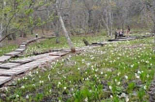 尾瀬に行かなくても木道を歩き、気軽に約1万5千株の水芭蕉を見ることができるおススメスポット!ゴールデンウイークにはライトアップが行われ夜の散歩も楽しめます。