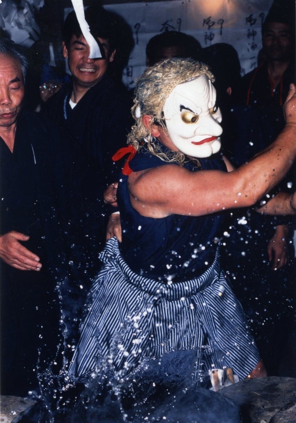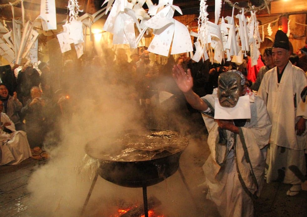 燃えさかる炎を囲み、神仏へ湯を献じ、新たな魂の息吹を起こす素朴な信仰と暮らしを伝える湯立神楽です。
