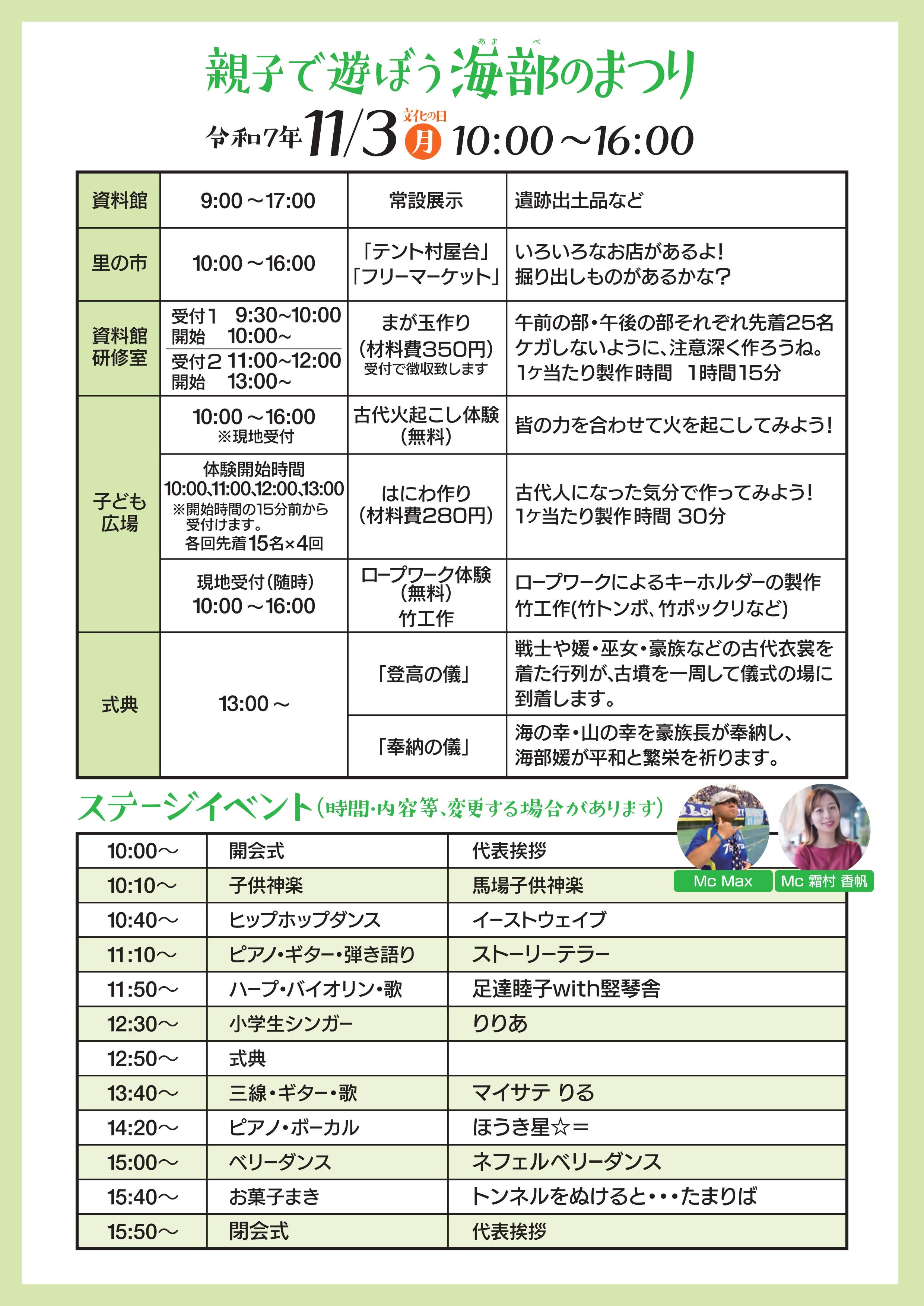 海部のまつりは、亀塚古墳公園を舞台に、古代衣装まとった人々による儀式の再現、火おこし・はにわ作り・勾玉づくりの体験など、大人から子どもまで市民が気軽に参加し、往時の海部の人々に思いを馳せるまつりです。