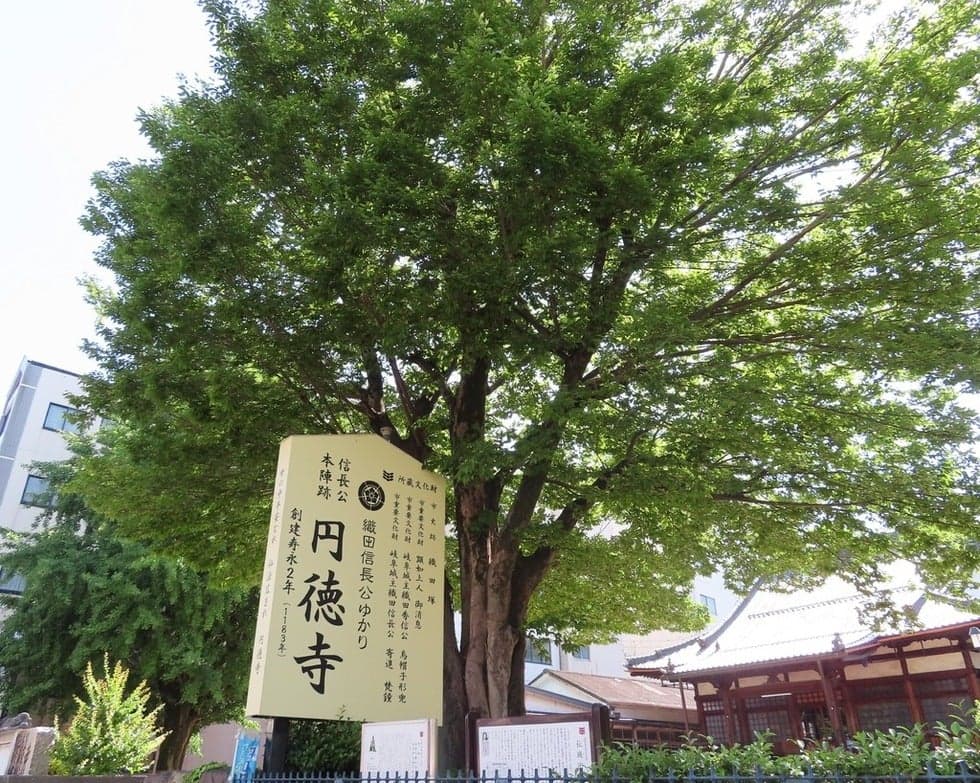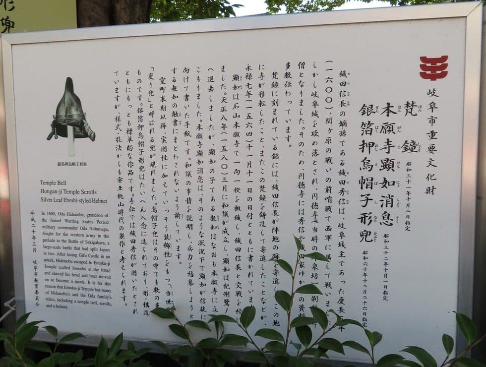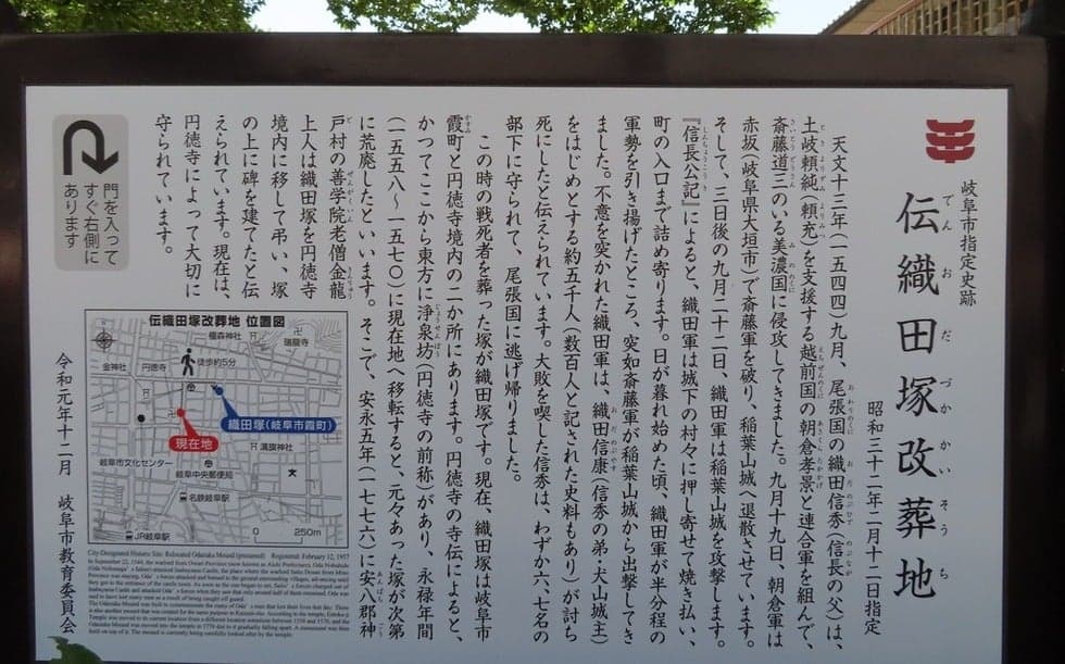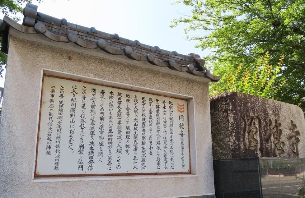 円徳寺は、上加納村長旗(現在の岐阜市長旗付近)にあった浄泉坊が前身といわれています。天文16年(1547年)、織田信秀公(信長の父)が岐阜(当時は井ノ口)に攻め入った際、斎藤道三公に大敗し約5000人の戦死者が出ました。この戦死者を弔うための織田塚が浄泉坊に築かれ、現在も円徳寺境内に安置されています。永禄10年(1567年)、織田信長公が、円徳寺門前(当時は浄泉坊という)に立てた「楽市場・定」の制札やその後、信長公が寄進の梵鐘などが寺宝として残されています。関ケ原の合戦 前哨戦「岐阜城の戦い」で池田輝政、福島正則に敗れた織田秀信公が剃髪し仏門入りした時の秀信公髪切塚があります。●楽市楽座制札附織田信長百姓帰住制札・・・国指定重要文化財