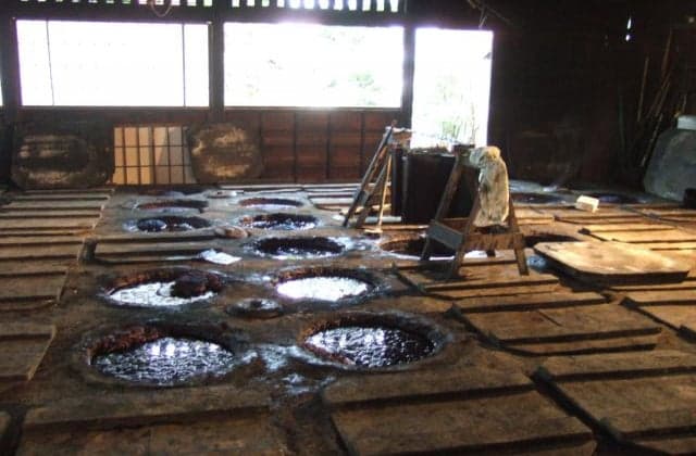 築220年以上の茅葺きの建物内には、72もの藍甕が並びます。