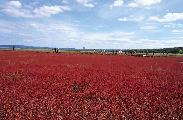 能取湖は、オホーツク海とつながる面積58万平方mの大きな塩水湖。湖畔は原生花の宝庫そのものだが、南岸・卯原内に3万8000平方mのサンゴソウ大群落が広がる。正式にはアッケシソウと呼ばれるこの植物は、葉の生えない珍しい草。卯原内だけでなく、湖畔のあちこちに点在し、9月になると全体が深紅の色を帯び、まっ青な湖水との見事なコントラストをつくりあげる。