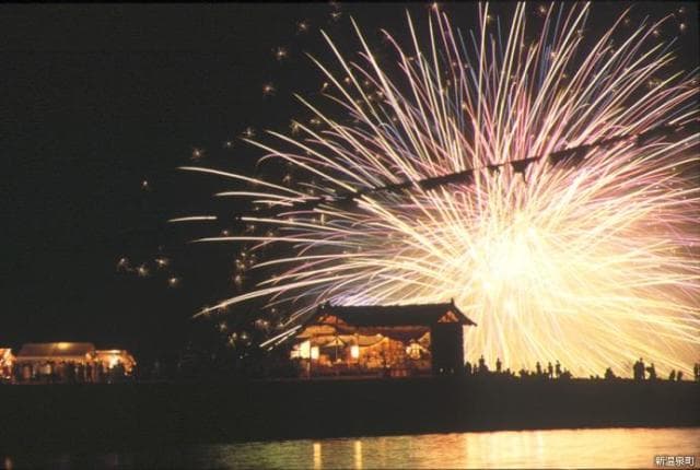 浜坂港湾防波堤から海上で打ち上げられる花火大会。砂浜に寝転がって見ることができる。