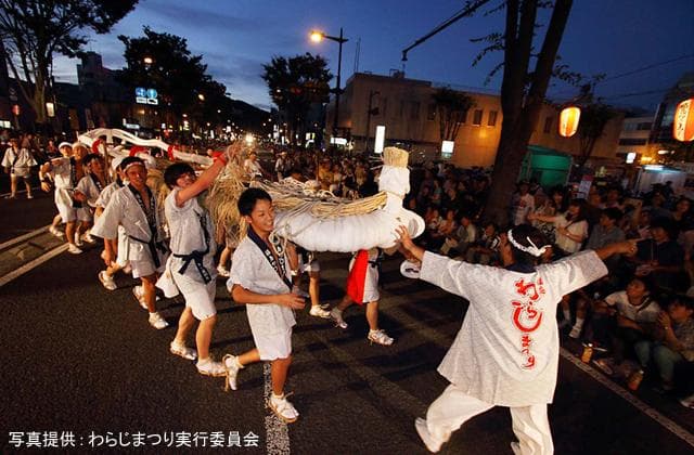 福島わらじまつりは、400余年の伝統を有する「信夫三山暁まいり」に由来する伝統的な祭りで、毎年8月上旬に開催します。ダイナミックな音楽に合わせてわらじおどりが繰り広げられ、12mの大わらじが練り歩きます。