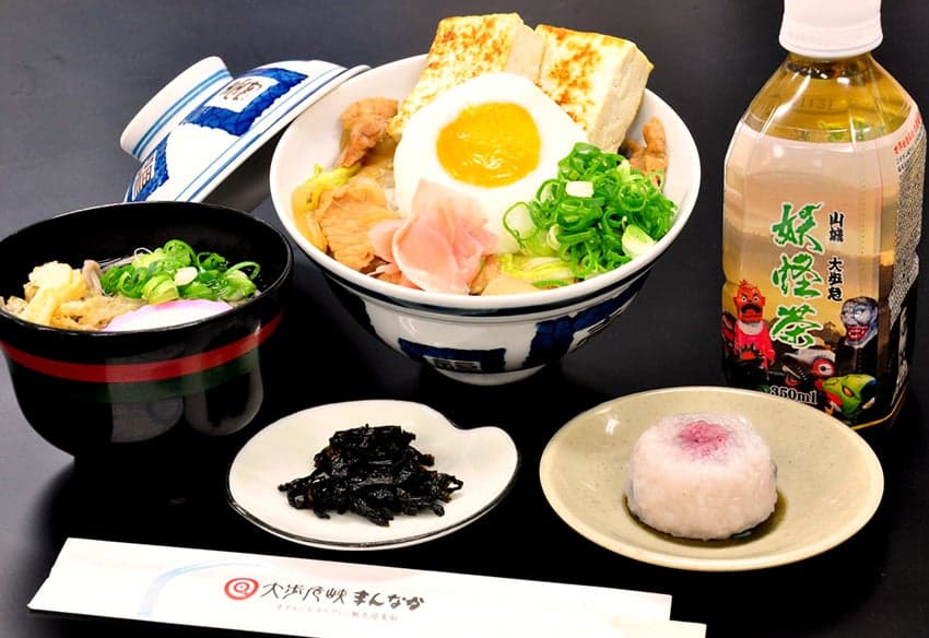 妖怪に登場する一つ目妖怪をイメージした、祖谷の岩豆腐や、たっぷり煮込んだ猪豚肉がとってもジューシーなどんぶり。祖谷そばや妖怪茶などもセットでお得です。1日20食限定!