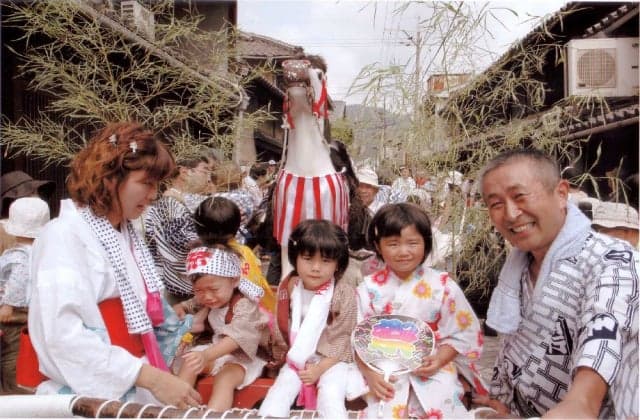 子どもの誕生と健やかな成長を願い、大小の「朔の馬」(荷台付き馬の模型)がゆったりと港町の町並みを、太鼓の響きと共に行進します。