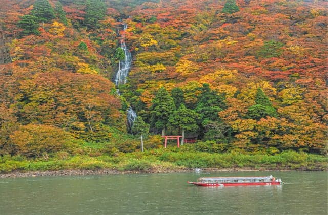 草薙温泉の対岸にあり、日本の滝百選のひとつ。最上峡の滝群で最大であり、落差約120m。紅葉時が最高。最上川に流れる水が白い糸のように見えるので、白糸の滝と名付けられた。