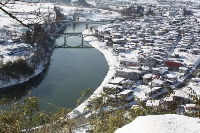 JR左沢線の終点、左沢駅の北側の高台にあり、地元の豪族大江氏の左沢楯山城跡地にある公園です。頂上東屋からは、眼下に迂回する最上川の雄大な流れと、朝日連峰・蔵王の山々を眺めることができます。この場所は全長224kmある最上川の中でも絶景とされており、数多くの画家や写真家が県内外から訪れるほか、この眺望の良さから平成9年には最上川ビューポイントに、平成14年には日本遊歩百選に選定されております。