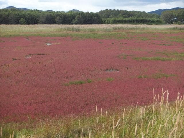 湖畔一面にサンゴ草が密生し,赤いじゅうたんを敷きつめたようになる。