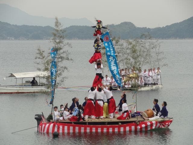 今治地方の特徴ある獅子舞の特色の一つとして継ぎ獅子があり、三継・四継等高度の芸を披露する。この継ぎ獅子では渡御の余輿として船上で演ずる、九王龍神社の船上継ぎ獅子が有名である。継ぎ獅子の上段では獅子頭をつけた獅子子が芸を演じる。