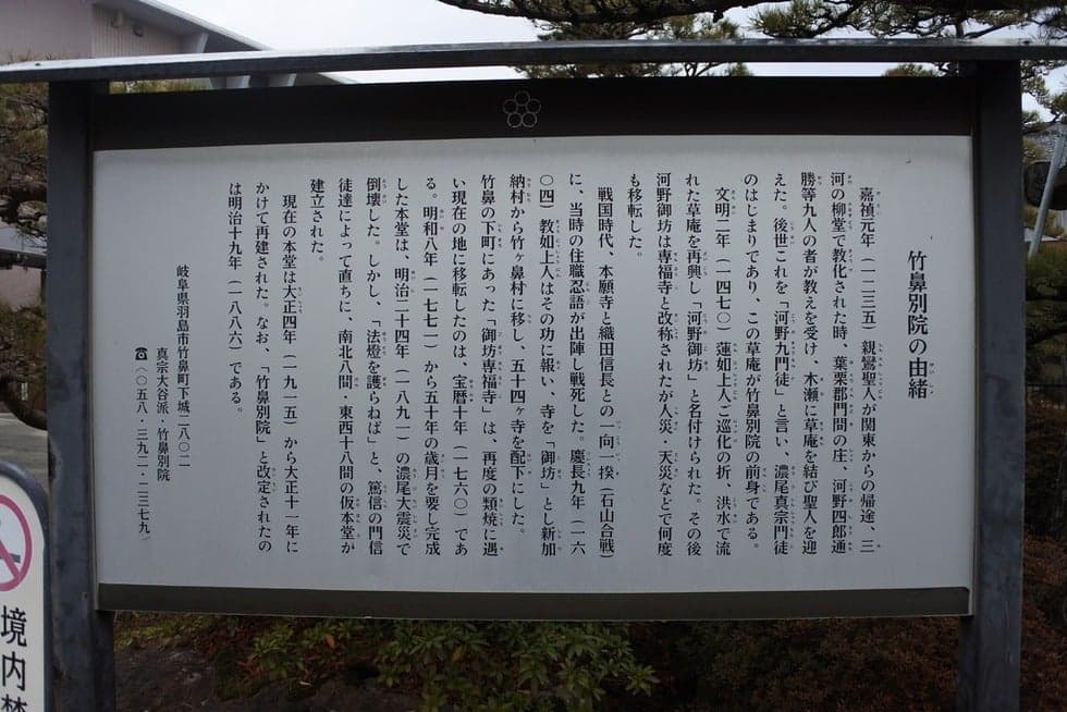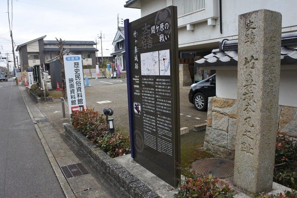 羽島市歴史民俗資料館(竹鼻別院前)の敷地内に竹ヶ鼻城跡の石標は立っています。応仁年間に武腰伊豆守が竹ヶ鼻城を築城したと云われています。その後、不破源六広綱が城主時代に、羽柴秀吉(後の豊臣秀吉)による「水攻め」があったことで知られてます。竹ヶ鼻城跡の位置は、この地の辺りを本丸の跡地とする諸説がありますが未だ確証は得られていません。関ケ原の合戦前夜の福島正則は、慶長5年(1600年)8月22日に加賀野井城をおとし竹ヶ鼻城へ向かいます。尾越(現在の愛知県一宮市)対岸の大浦(羽島市)に布陣していた竹ヶ鼻城主・杉浦重勝は慌てて竹ヶ鼻城へ戻り、本丸で30余名になるまで防戦しましたが、福島正則によって攻囲され竹ヶ鼻城は落城し火を放って自刃しました。