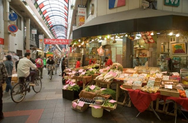 浪速っ子の胃袋をあずかり、卸売と小売の機能を兼ねそなえた江戸時代後期からつづいている市場。千日前から南へ約580mの間に、鮮魚をはじめ青物・果物、飲食、衣料品など約170店舗が軒を並べ、平日は約18000人、年末になると約15万人がやってくる。文政5~6年(1822-1823)ごろ、日本橋の圓明寺付近にあった黒い山門のあたりに商人が集まり、堺や紀州から入ってきた魚を売ったのがその始まり。明治45年(1912)の難波火災によって寺とともに焼失するまでは、「圓明寺市場」と呼ばれていたそうだ。その後は大阪の大空襲で再び焼失したが、戦後に復興して現在に至っている。料亭の板前さんの買い出しが多いことから、市場にはフグやすっぽんの店が多い。年末には大勢の買い物客で活気あふれる。