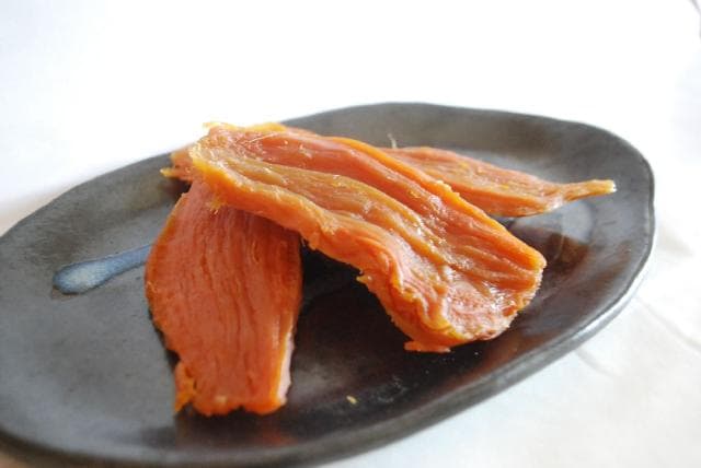 古くから海女さんたちのおやつとして親しまれている保存食。隼人いもという品種のサツマイモを煮て干し乾燥させたもので、適度な粘りと、やさしい甘みが特徴。