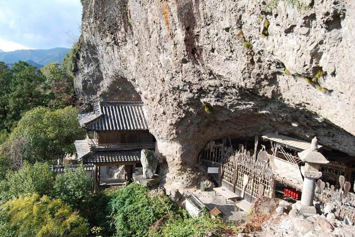 八面山から望む岩山を目指し参道の細く長い石畳を行くと、「羅漢寺」があります。羅漢寺と、対岸に盛り上がるごつごつとした峰「古羅漢」の探勝道の天然の石橋や岩窟、岩肌に巡らせた鎖をつたい登れば、日本最古の「五百羅漢」をはじめとした二千体もの石仏に出会えます。