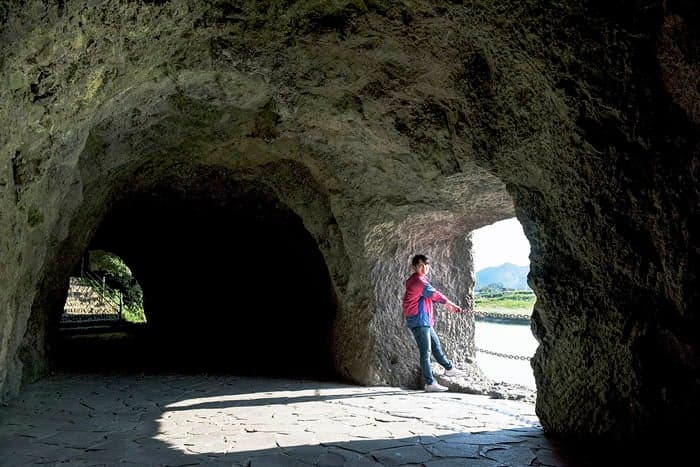 羅漢寺から下った山国川沿いに、屏風を立て並べたように折り重なる巨大な絶壁「競秀峰」が現れます。ここは福澤諭吉が土地を買い、開発から守った景勝地です。トンネル「青の洞門」は、この岩壁沿いの道から川に落ちて亡くなる人々を救うため、約200年前に禅海(ぜんかい)和尚が30年かけて掘ったもので、岩窓からさす光に照らされた無数のノミ跡から、和尚の熱い想いが伝わってきます。
