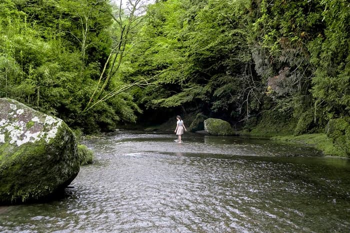 森城下町から西に回遊すると、にょきにょきと伸びる石柱群の裾に集落が寄り添う「裏耶馬渓」に到着します。さらに山国川を遡った先の源流の地「奥耶馬渓」では、石が何万年もの時をかけ川底にあけた甌穴(おうけつ)群の水辺が続きます。奥深い谷や岩窟は落人伝説を生み、平家の落人が河童となり登場する河童祭りが伝えられています。
